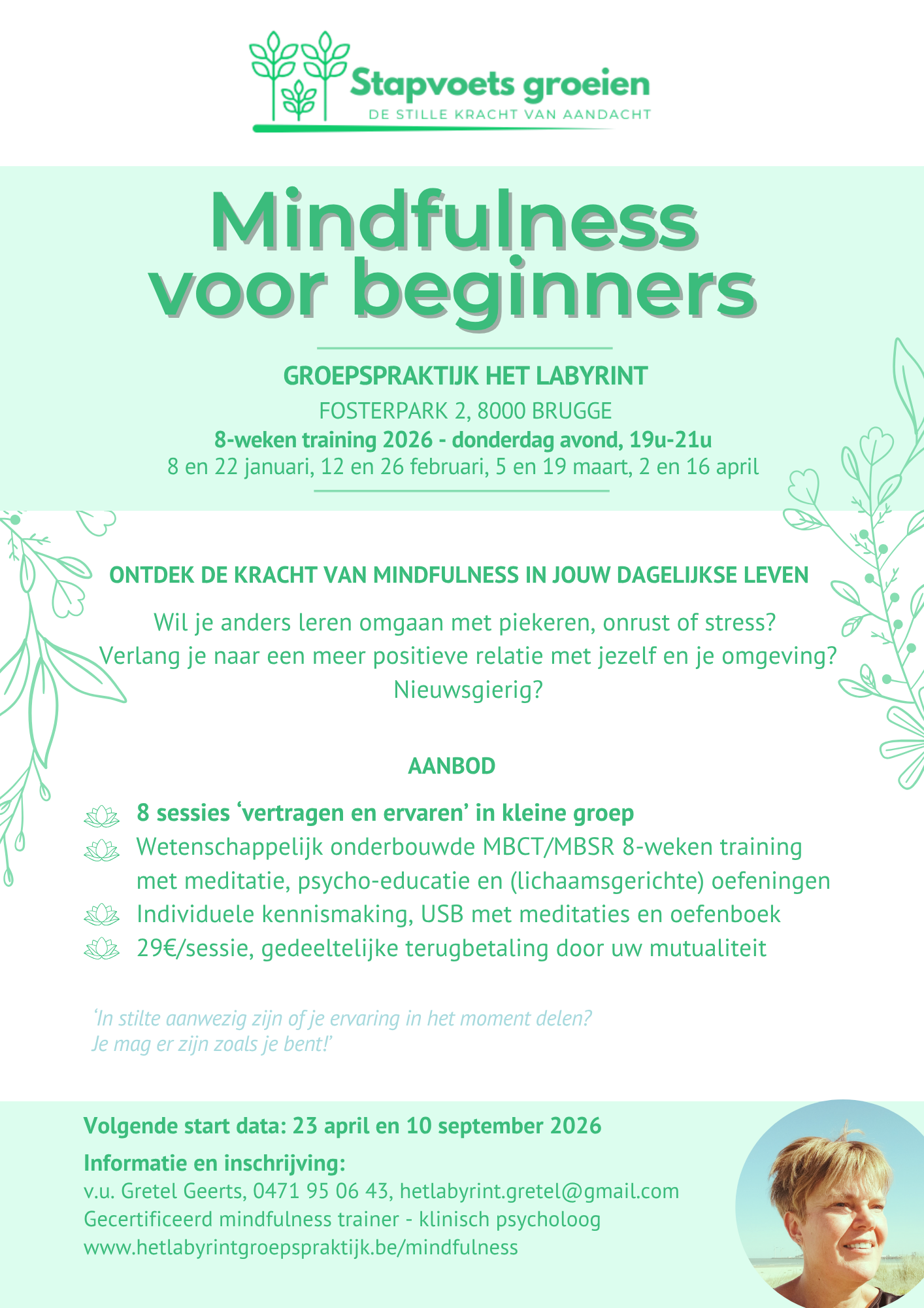 Mindfulness voor beginners, MBCT/MBSR 8-weken training in Groepspraktijk Het Labyrint te Brugge